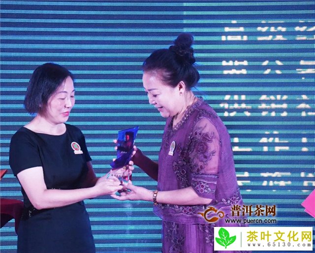 湖北省茶业集团总经理金莉为终身孝敬奖得到者——史秀梅颁奖